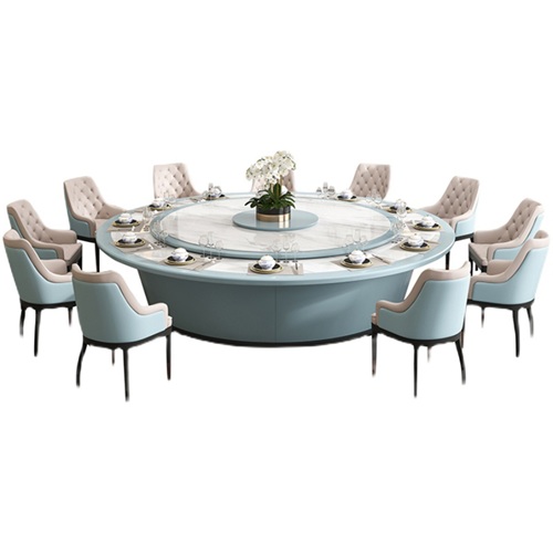 酒店大理石多功能旋轉(zhuǎn)電動餐桌子,采用的是雪白的天然大理石做桌面,底座與包邊則是使用天藍色,兩種顏色搭配起來非常時尚。
