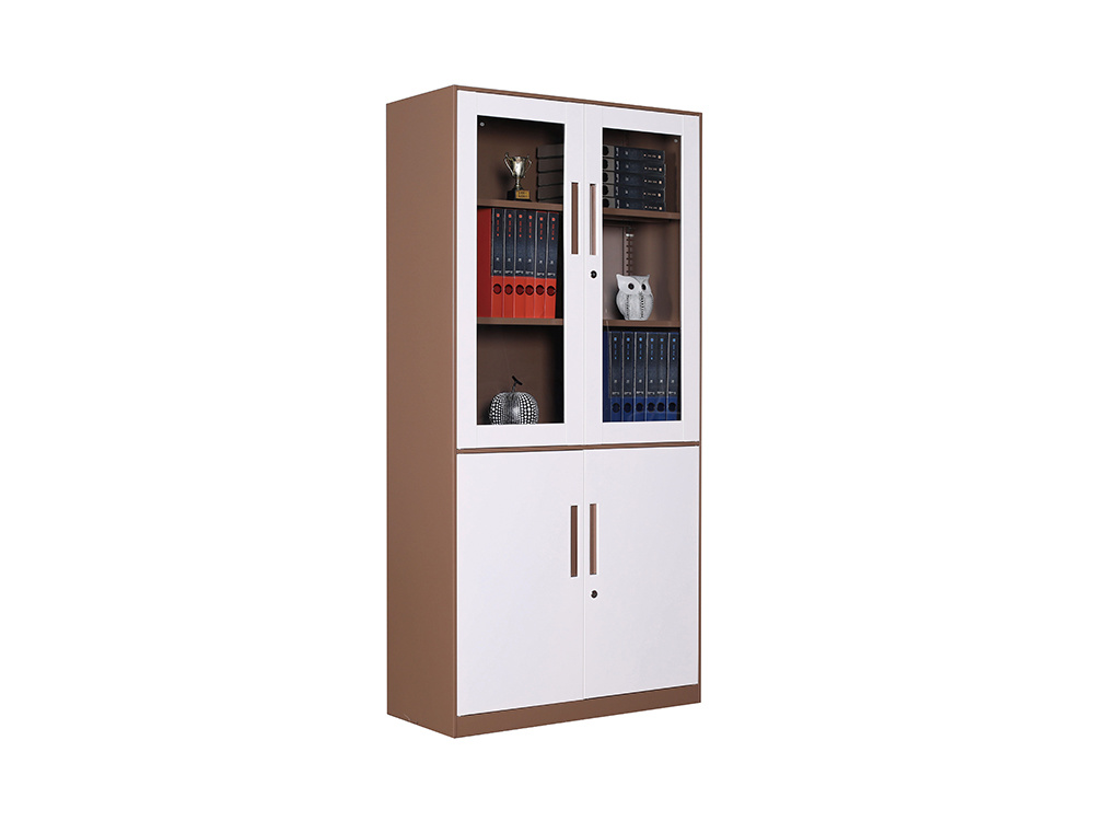 ● 一體結(jié)構(gòu)設(shè)置,上部玻璃對(duì)開門,內(nèi)置1層層板可調(diào)高度,內(nèi)置物品可視,便于拿取,中間2個(gè)抽屜,下部對(duì)開鐵門、門內(nèi)一格板,設(shè)置有拉手和鎖。
